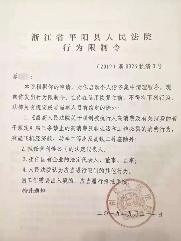 9月27日,平陽法院簽發了對蔡某的行為限制令,并終結對蔡某在本次清理所涉案件中的執行。最終,該案得以順利辦結。